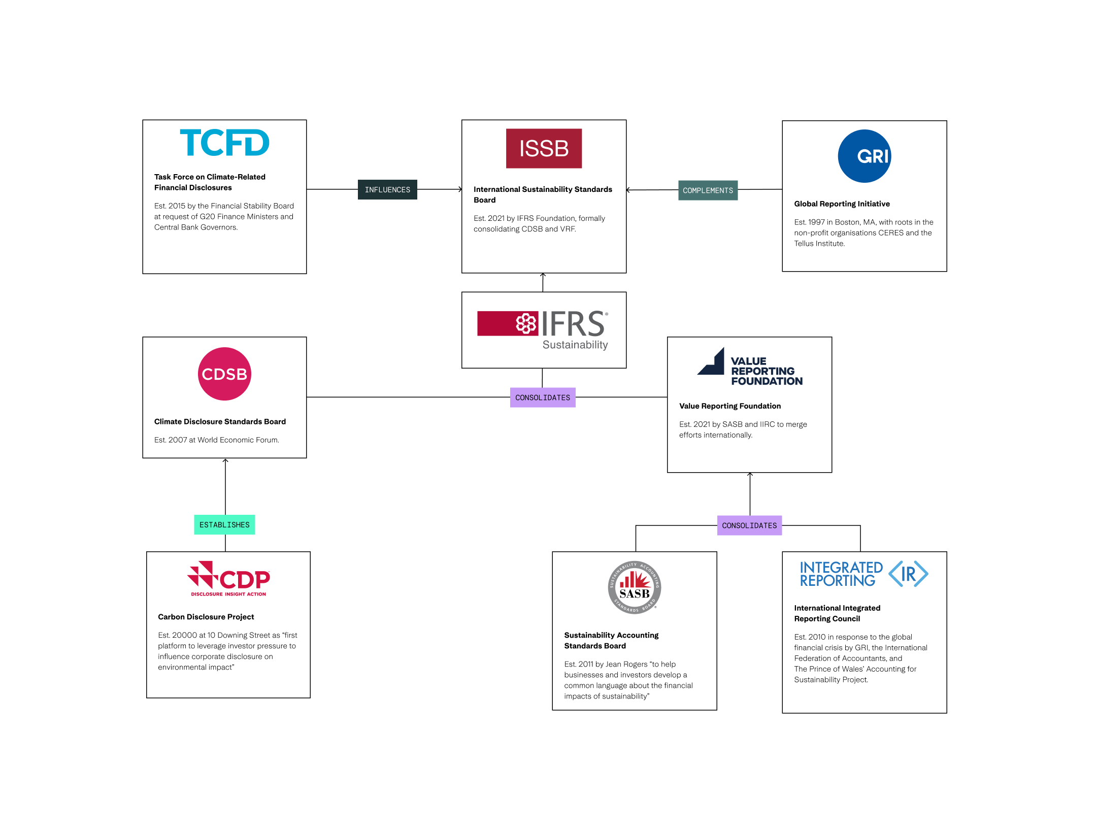 The graphic depicts how the different sustainability related standards interrelate, showing that the IFRS wraps up a range of investor-driven disclosures and frameworks such as CDP, SASB and IR and their reporting boards, while being the standard issued by ISSB, the standard governance body. Both IFRS standards are heavily influenced by the structure of the TCFD framework and IFRS 2 draws on TCFD's framework content. GRI and ISSB sit alongside each other and complement one another through fulfilling the impact materiality (GRI) and financial materiality (ISSB) aspects of double materiality, and informing sustainability reports and integrated report content. The IFRS standards draw on the principles of GRI in its own principles of comparability, verifiability, timeliness and understandability.