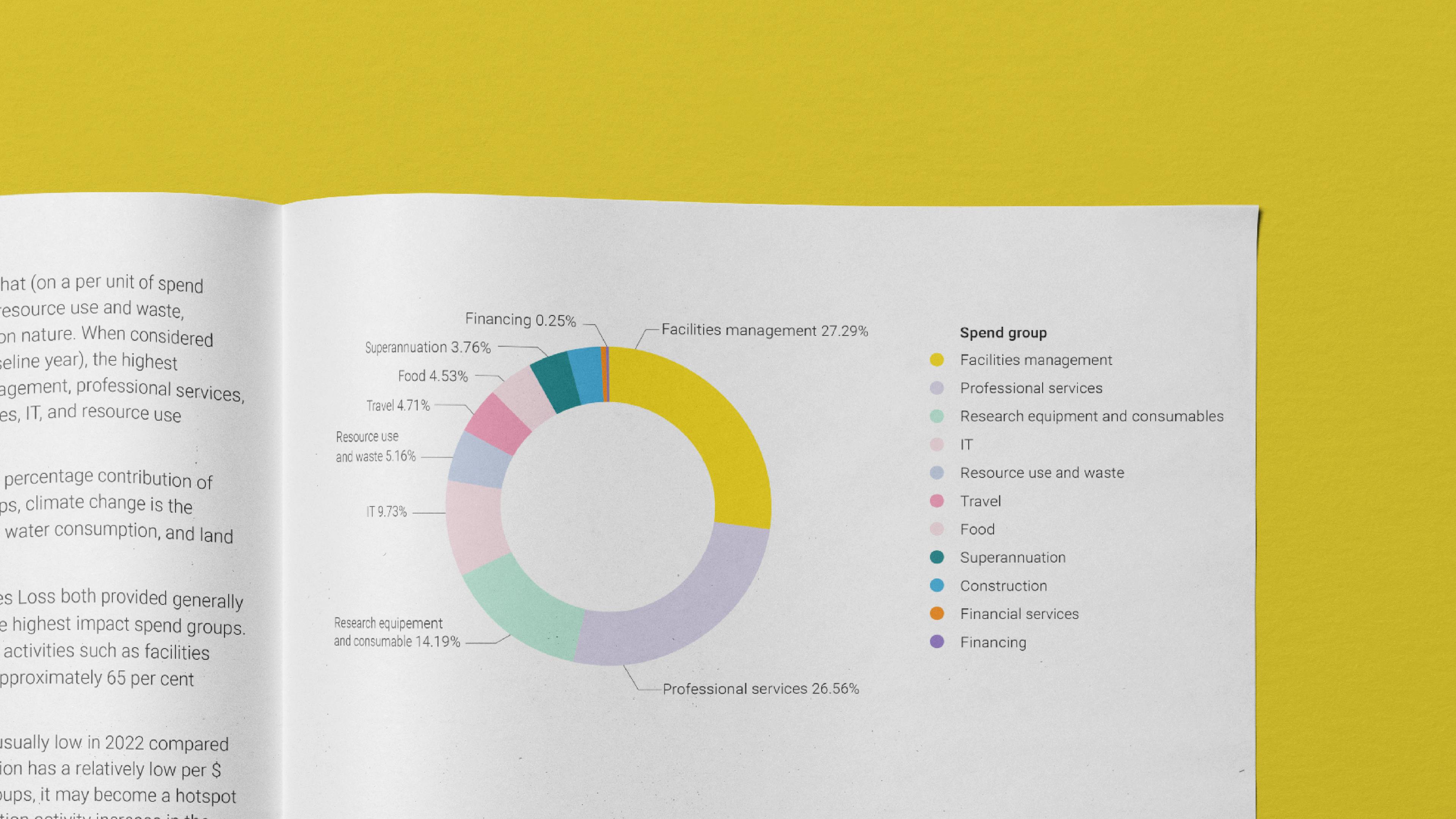 The Nature Impact Score identified that (on a per unit of spend basis) food, facilities management, resource use and waste, and travel carry the highest impact on nature. When considered according to 2022 spend (baseline year) facilities management, professional services, research equipment and consumables, IT, resource use and waste have the highest impact footprint.