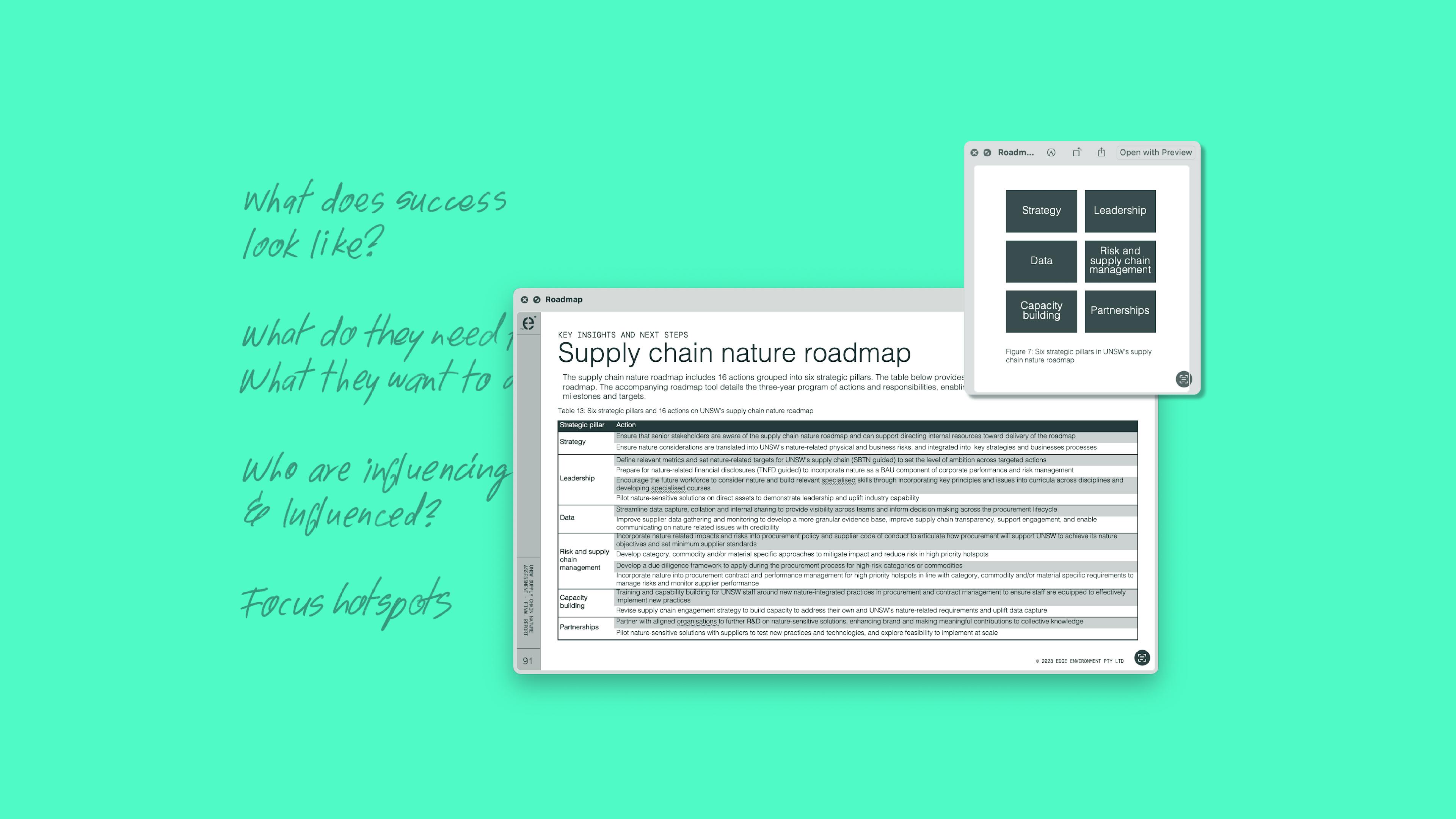 The evidence base informed a three-year roadmap to develop the foundations for making evidence-based purchasing decisions, building internal and external capability and piloting nature sensitive solutions in partnership with key UNSW suppliers to explore feasibility, scalability, and opportunities for a positive impact on nature.