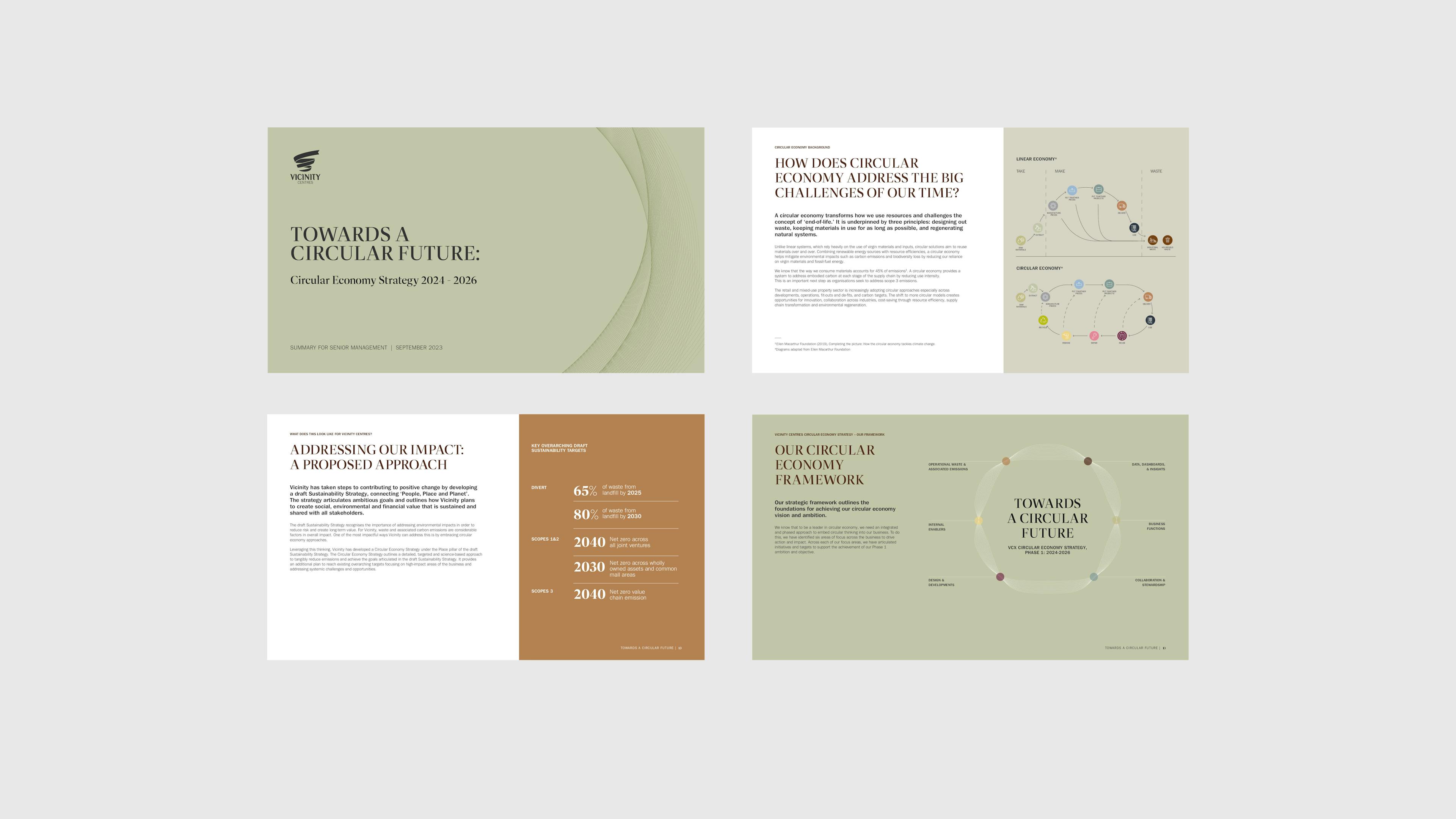 Taking inspiration from the existing Vicinity Centres brand identity, we build out a suite of communication materials that brought the strategy to life through sustainability creative. We wanted to ensure the that the strategy would engage the internal teams and help build a sense of ownership and pride in the work that Vicinity is doing in the circular economy space.