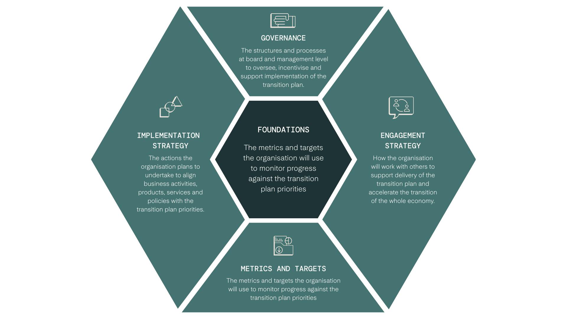 - Strategic planning: Section 4 of the guidance outlines how to incorporate nature into your Transition Plan. It is centred around the five themes for transition planning that form the base of the TPT guidance. These themes are foundations, implementation strategy, engagement strategy, metrics and targets and governance. See Figure 2 on page 5 of the guidance, featured below.
