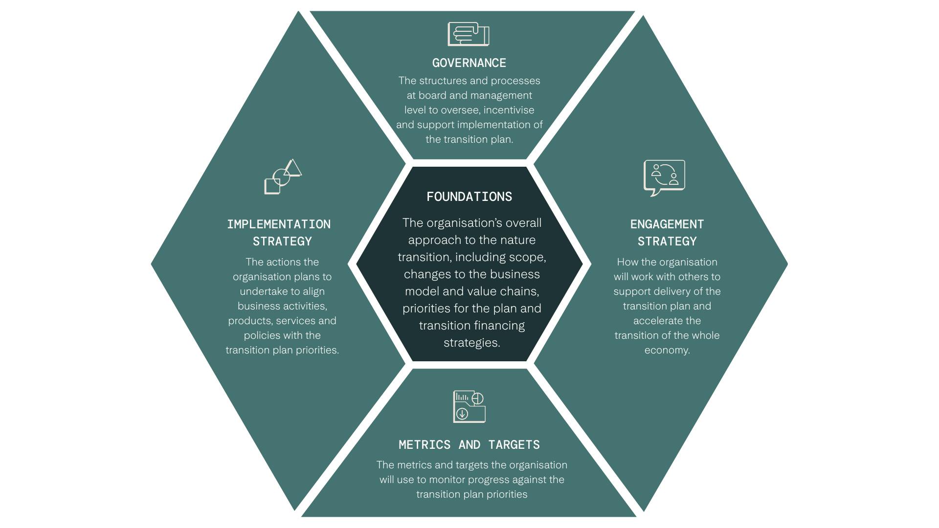 - Strategic planning: section 4 of the guidance outlines how to incorporate nature into your Transition Plan. It is centred around the five themes for transition planning that form the base of the TPT disclosure framework. These themes are foundations, implementation strategy, engagement strategy, metrics and targets and governance. See Figure 2 on page 5 of the guidance, featured below.
